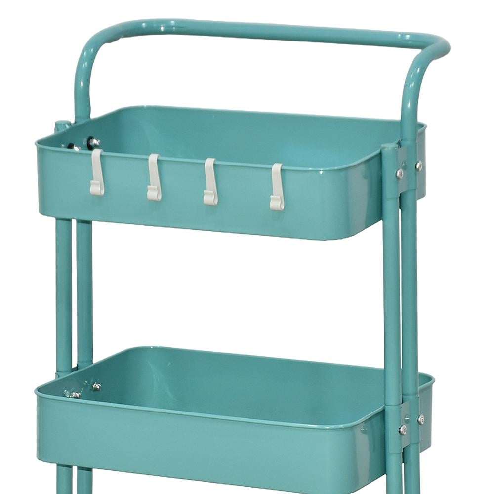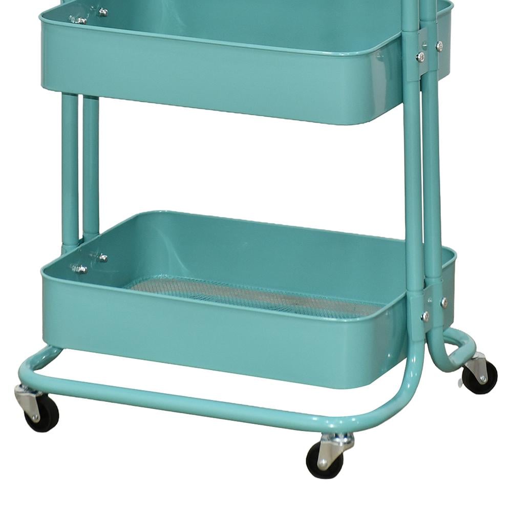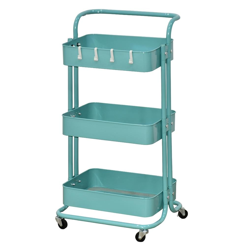 أضف لمسة من العملية والجمال لمساحتك مع وحدة رفوف متحركة 3 أدوار باللون التيفاني الجذاب. تصميم مدمج مزود بعجلات قوية يسهّل التنقل، مع علاقات علوية لتعليق الأدوات، مما يجعلها مثالية لترتيب وتخزين أغراضك اليومية في المطبخ، الحمام، غرفة الغسيل أو أي مساحة تحتاج إلى تنظيم إضافي.